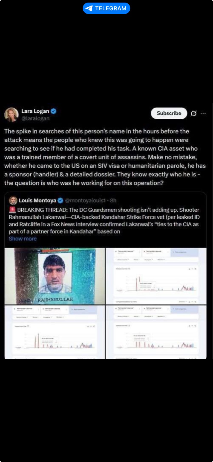 The spike in searches of this person's name in the hours before the attack means the people who knew this was going to happen were searching to see if he had completed his task. A known CIA asset who was a trained member of a covert unit of assassins. Make no mistake, whether he came to the US on an SIV visa or humanitarian parole, he has a sponsor (handler) & a detailed dossier. They know exactly who he is - the question is who was he working for on this operation?
