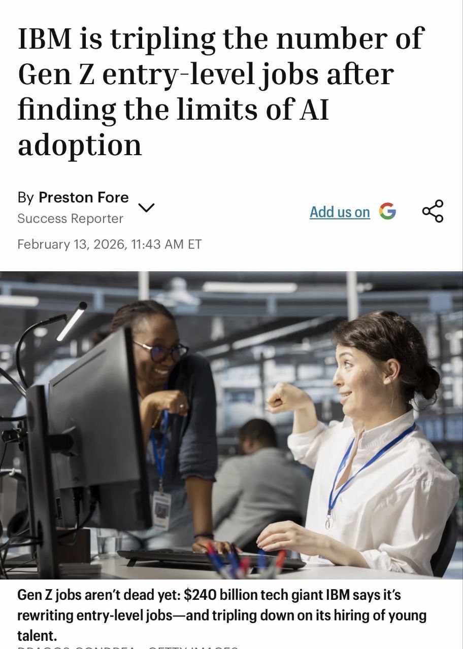 IBM says the most successful companies will be the ones hiring for entry level jobs because AI isn’t a sustainable long term strategy