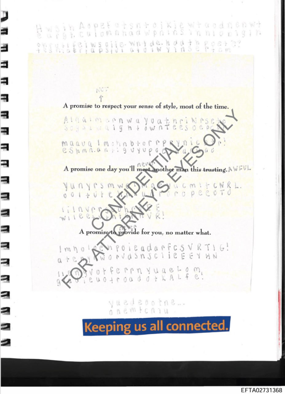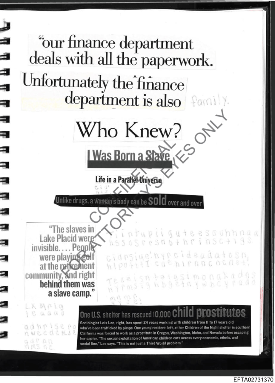 Attached is what appears to be a victim’s diary. It's hard to read, in all meanings of "hard". Part is typed, part is done in magazine clippings, part is coded.